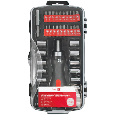 Our 38pc Ratchet Screwdriver Set is an invaluable tool set when loosening and tightening an assortment of fixings such as various types of screws, nuts and bolts with a complete range of sockets & screwdriver bits included. The robust multi-function ratchet screwdriver has a soft-grip ergonomic anti slip handle that makes it comfortable and safe to use for extended periods. The ratchet’s 58mm magnetic bit holder allows for sockets and screwdriver bits to securely stay on during active use. Perfect for all sorts of DIY & maintenance tasks around the home and workplace.