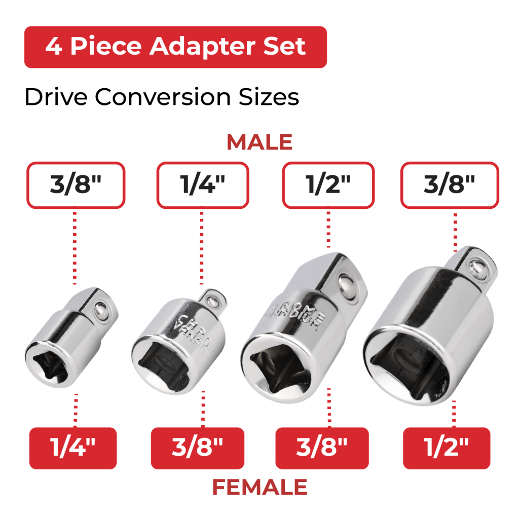 This versatile adaptor set covers the most commonly used socket size conversions, allowing you to quickly switch between different ratchets, extensions, and sockets without the need to change tools. It saves time, improves workflow efficiency, and ensures you always have the right drive size for the job.