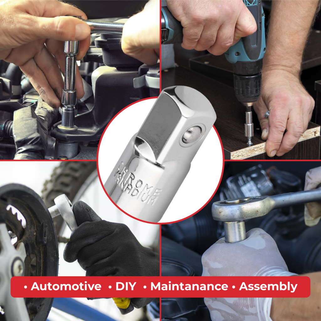 Each adaptor is fitted with a spring-loaded ball detent that firmly locks sockets into place during use. This secure locking mechanism prevents accidental slipping or dropping, giving you greater confidence and control when working in tight spaces or awkward angles.