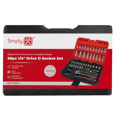Our 58pc 1/4″ Drive D Socket Set is ideal to safely tighten or loosen bolts and is a great addition to your existing tool kit. Whether you’re working on your car, van, lorry, boat or projects around the home or workplace, our great value 58pc 1/4″ Drive D Socket Set will offer you the dependable reliability you’re after to get the job finished.
