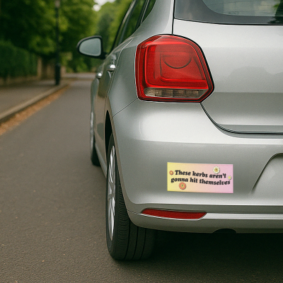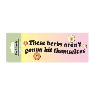 A fun and quirky bumper sticker with the phrase “These Kerbs Aren’t Gonna Hit Themselves” — perfect for adding personality to your car or workspace.