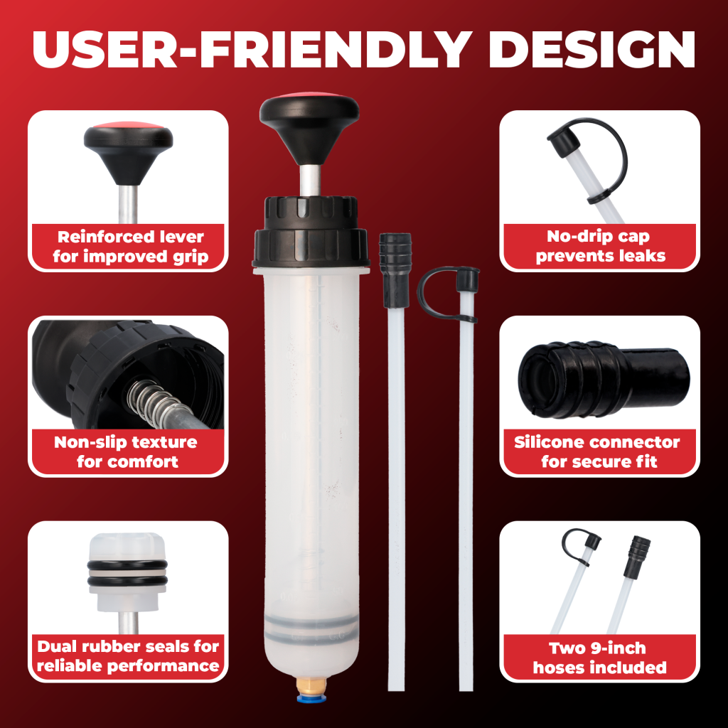 Built from high-quality, chemical-resistant materials, the pump withstands repeated use with a variety of fluids. Dual rubber sealing rings ensure a tight fit, preventing leaks and maintaining consistent suction power. The sturdy plunger mechanism operates smoothly, while the reinforced barrel design provides long-term durability, even under frequent workshop use.