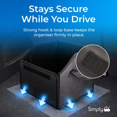 Featuring a strong hook and loop fastening system on the base, the organiser firmly grips onto your car’s boot carpet to stay securely in position. This added stability helps prevent unwanted movement while driving, reducing the risk of items shifting, tipping, or spilling during sudden stops or sharp turns.