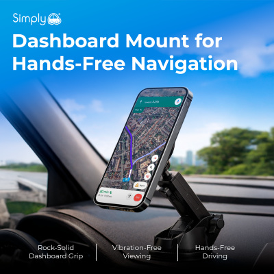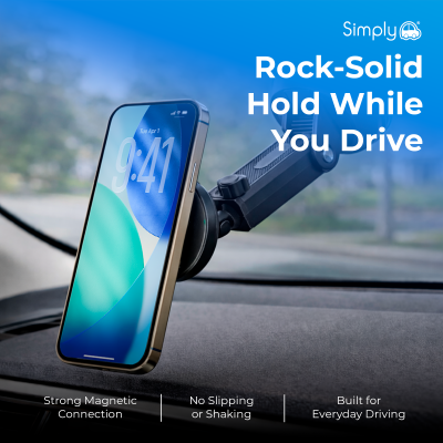 The Simply Auto Magnetic Phone Mount is designed to keep your smartphone securely in place while driving, allowing for safe, hands-free navigation and calls. Featuring a strong magnetic head and a stable dashboard mounting base, this mount offers a reliable and convenient solution for everyday driving.