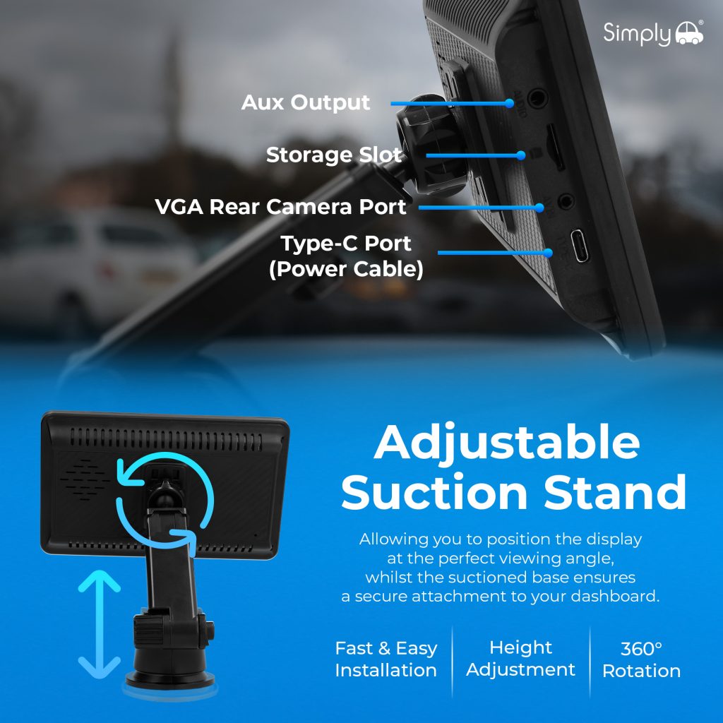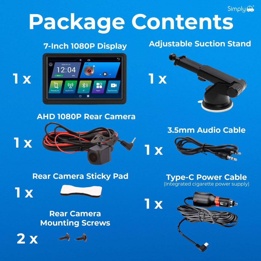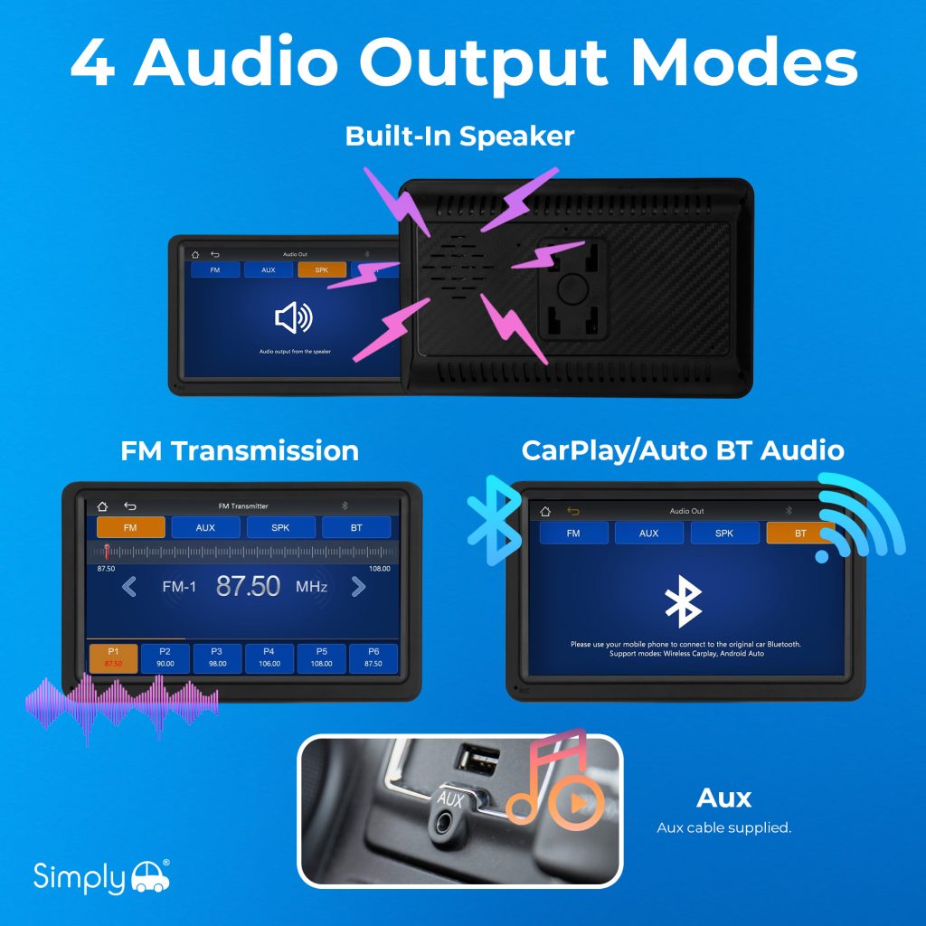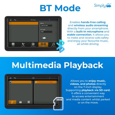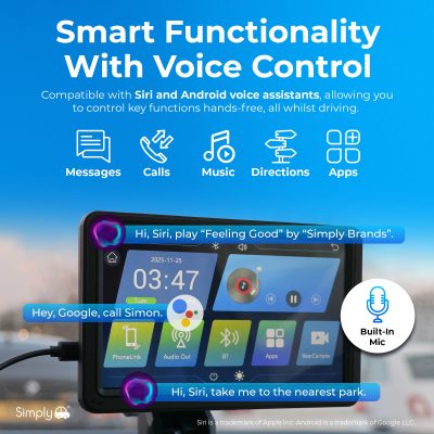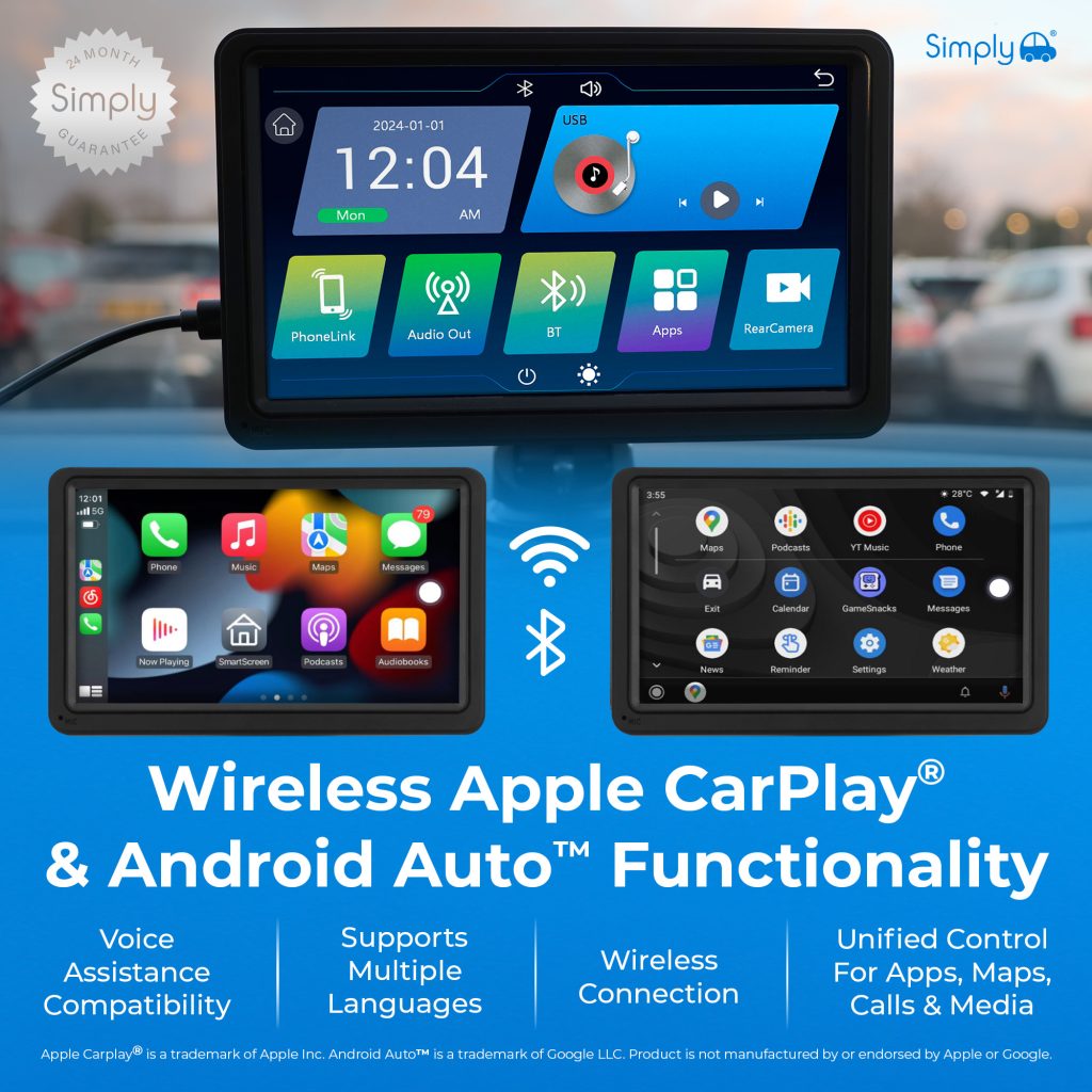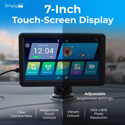 Upgrade your vehicle with the Simply Smart In-Car Display featuring wireless Apple and Android compatibility. Access navigation, music, calls, and messages directly from the 7-inch touch screen while keeping your focus on the road. The intuitive interface brings your favourite smartphone apps to your dashboard for a safer, smarter driving experience.