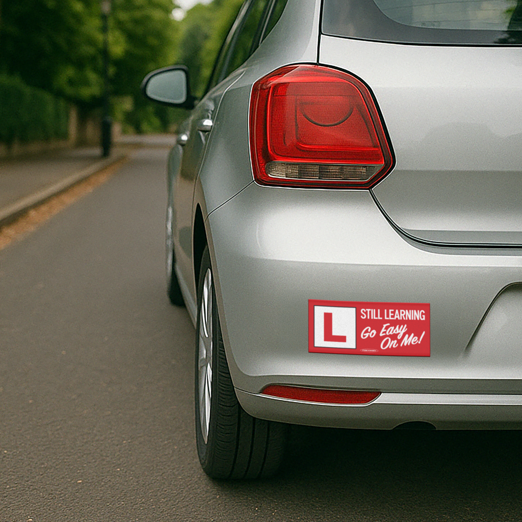 A reassuring bumper sticker: ‘Still Learning Go Easy On Me’.